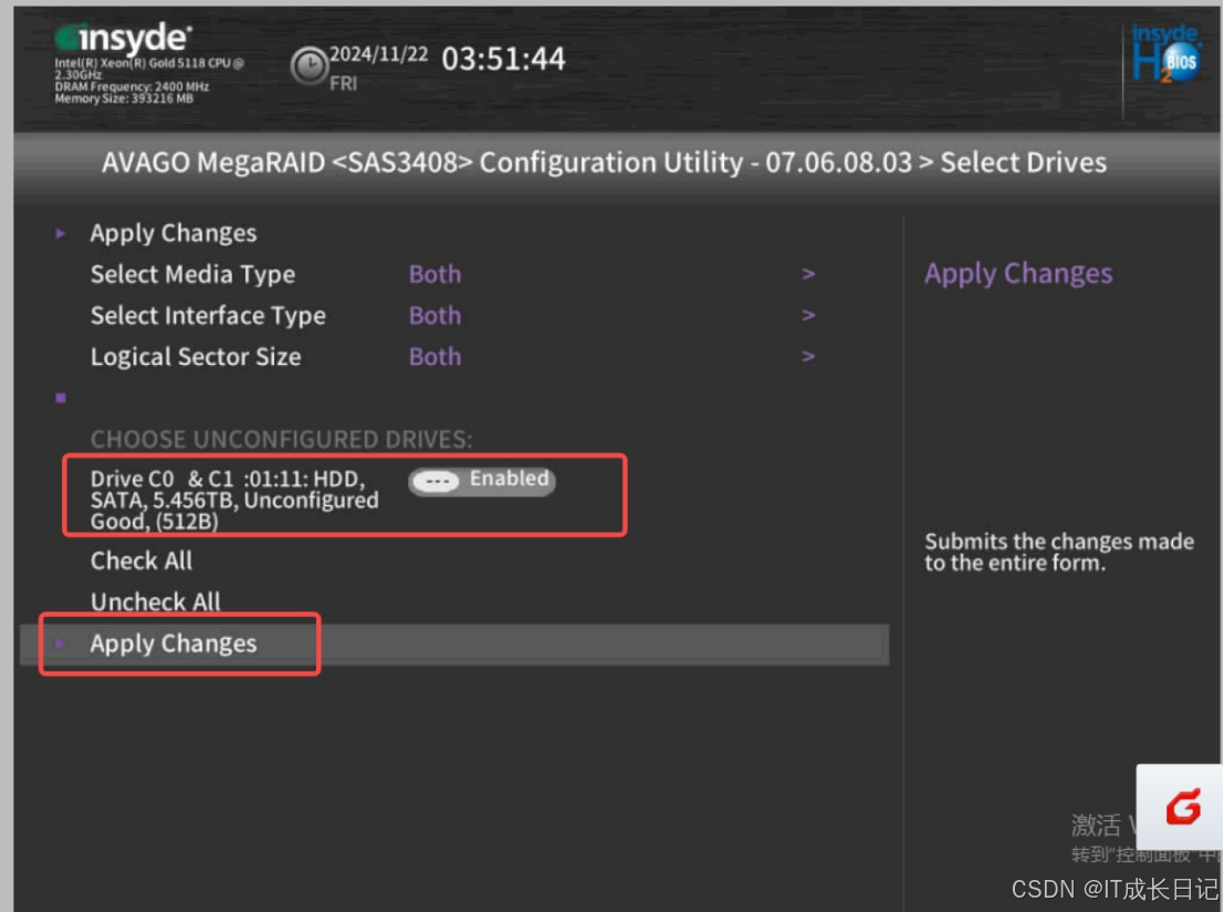 3.选中对应的硬盘,按Enter键,选择:Enabled,选择:Apply Changes,按Enter键