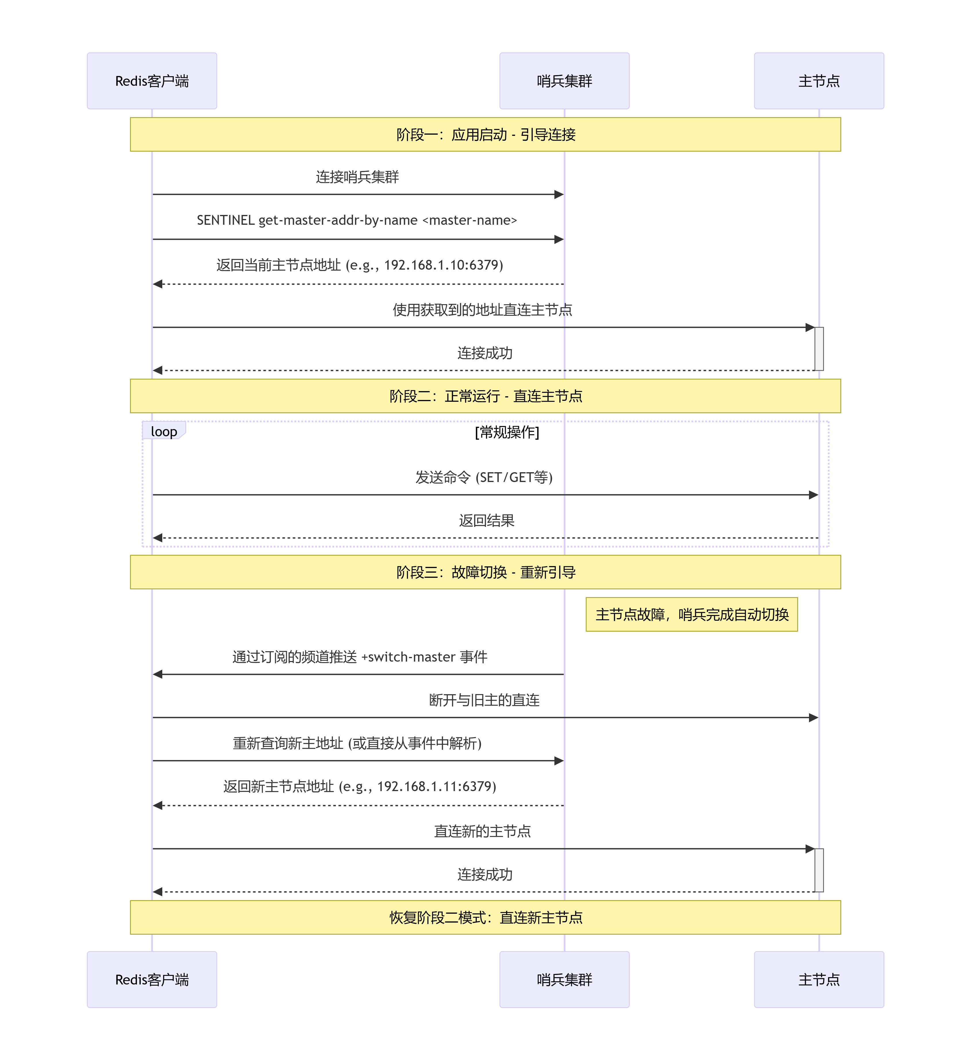 - 客户端角色:客户端不再是简单的直连,而是作为一个主动的服务发现参与者。它需要与哨兵交互并监听事件。