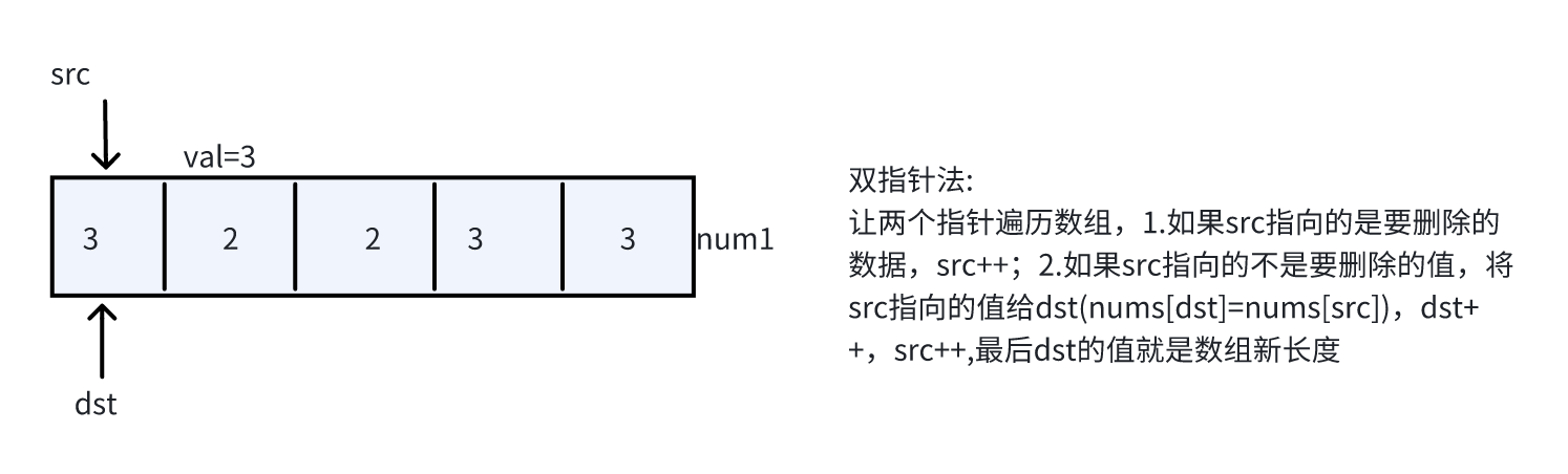 用快慢指针( src 和 dst )遍历数组,快指针src负责扫描,慢指针dst负责写入,遇到非目标值时就复制到慢指针位置,最终慢指针的位置就是新数组的有效长度。
