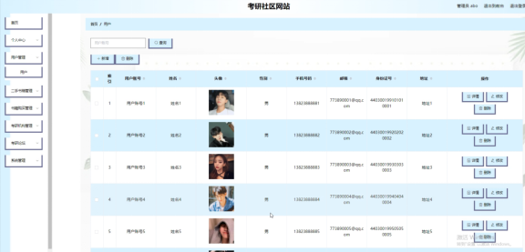 用户管理,在用户管理页面可以对索引、用户账号、姓名、头像、性别、手机号码、邮箱、身份证号、地址等内容进行详情,修改和删除等操作,如图5-9所示。