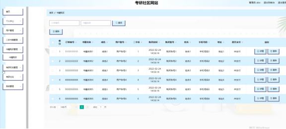 书籍购买管理,在书籍购买管理页面可以对索引、订单编号、书籍名称、成色、用户账号、二手价、购买时间、姓名、手机号码、地址、是否支付等内容进行详情和删除等操作,如图5-11所示。