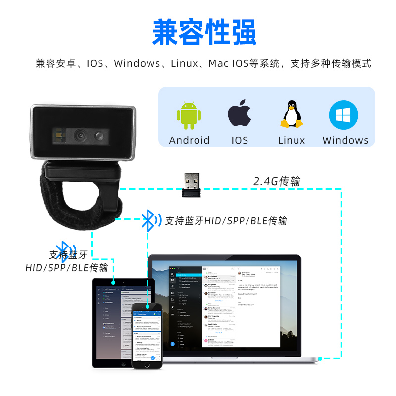 多模式无线传输技术的集成,保障数据传输的灵活性与稳定性。设备支持蓝牙+2.4G双无线传输模式,采用抗干扰协议优化,可实现与电脑、平板、手机等多类终端设备的快速配对与稳定连接,空旷环境下传输稳定无卡顿,适配仓库不同区域、不同终端的扫码数据传输需求,无需繁琐布线,提升设备部署灵活性。
