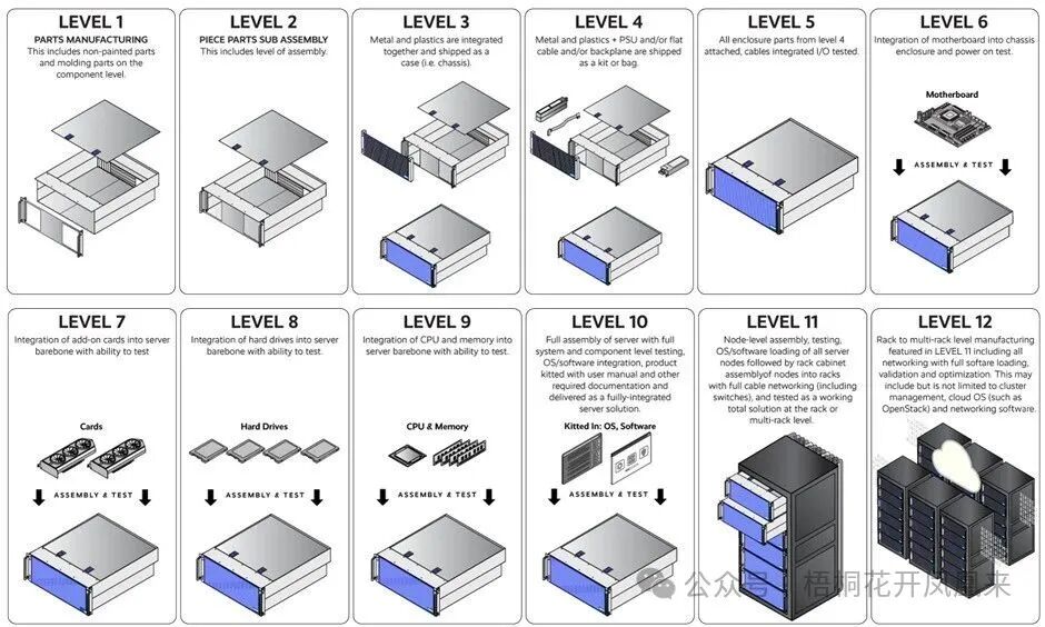 在服务器生产制造领域,根据服务器生产制造过程中的集成度不同,将服务器分为了12个级别(Level),即L1-L12。