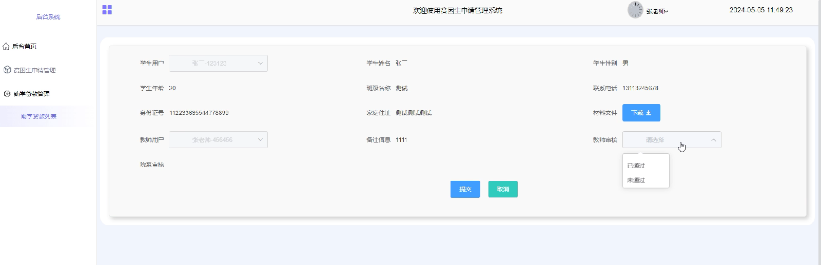 助学贷款管理:教师可通过该功能查询助学贷款的申请和发放情况,对每笔贷款进行详细的了解。同时,教师还可对学生的贷款申请进行审核回复,确保贷款发放的准确性和及时性,助学贷款审核界面如下图4-7所示。