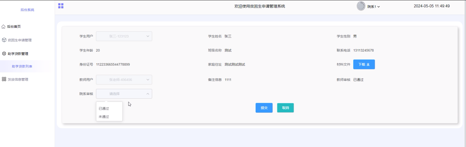 助学贷款管理:助学贷款管理功能为院系用户提供了一个便捷的平台,让他们能够轻松查询和管理所有助学贷款的记录。通过查看详情,院系用户可以了解到每一笔贷款的详细信息,包括申请理由、材料文件等。同时,他们还可以对贷款申请进行审核回复,确保每一笔贷款都符合相关规定,界面如下图4-9所示。