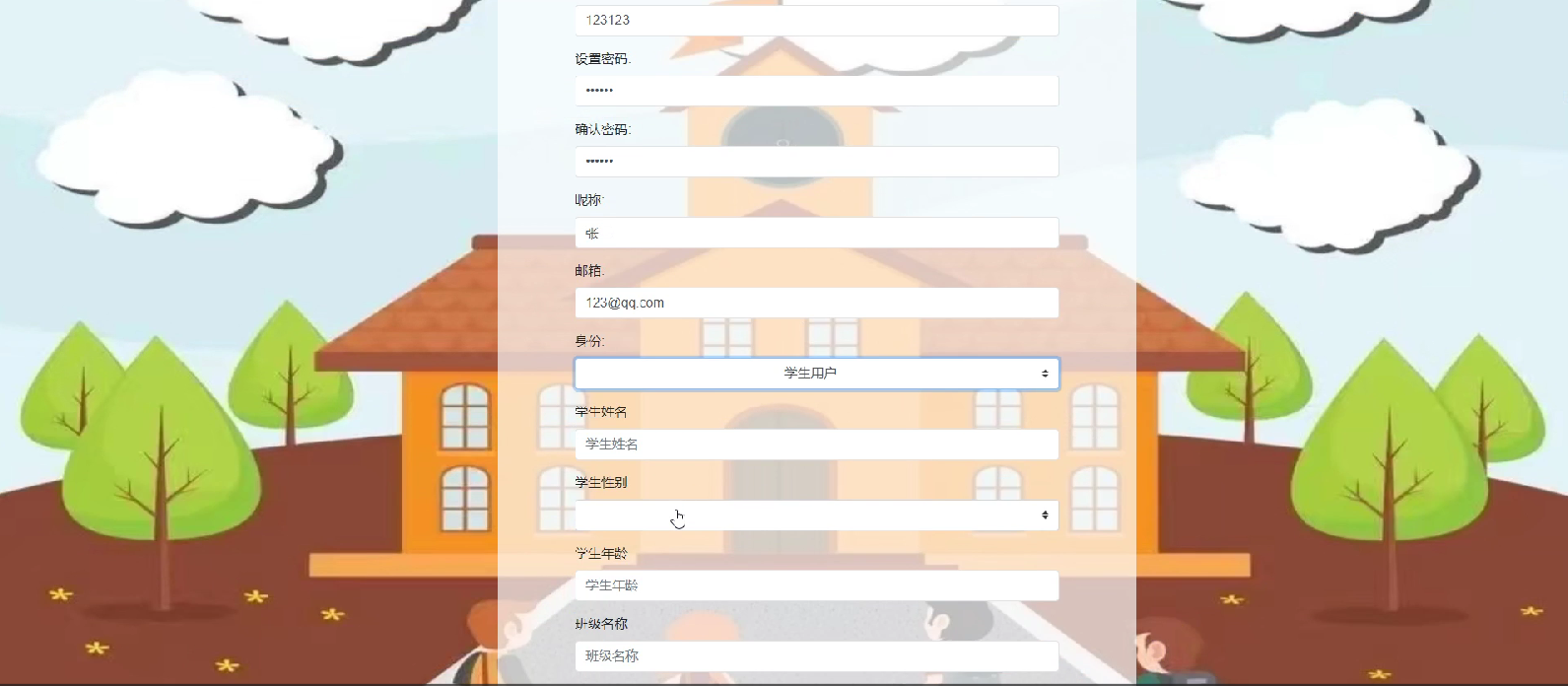学生可以进行注册登录,当用户右上角“注册”按钮的时候,当填写上自己的账号+密码+确认密码+昵称+邮箱+学生姓名+学生性别+学生年龄等后再点击“注册”按钮后将会先验证输入的有没有空数据,再次验证密码和确认密码是否是一样的,最后验证输入的账户名和数据库表中已经注册的账户名是否重复,只有都验证没问题后即可注册成功。其学生用户注册界面展示如下图所示。