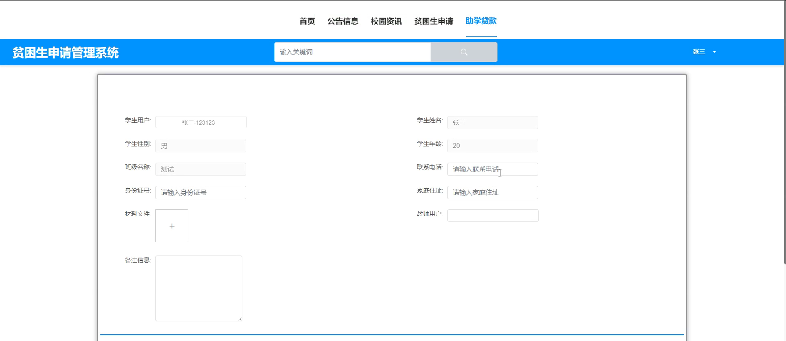 学生添加贫困生申请界面测试: