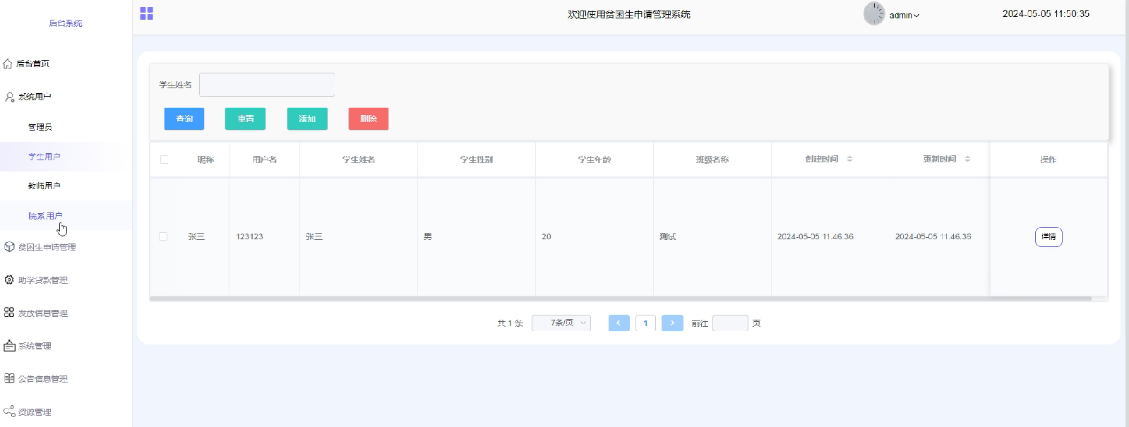 (2)贫困生申请管理:贫困生申请管理功能允许院系用户查看所有提交的贫困生申请,并可以详细查看每一份申请的具体内容。在审核过程中,院系用户可以对申请进行回复,给出审核意见。一旦审核通过,系统会在后台自动为贫困生发放贷款,确保资金能够及时到达学生手中。