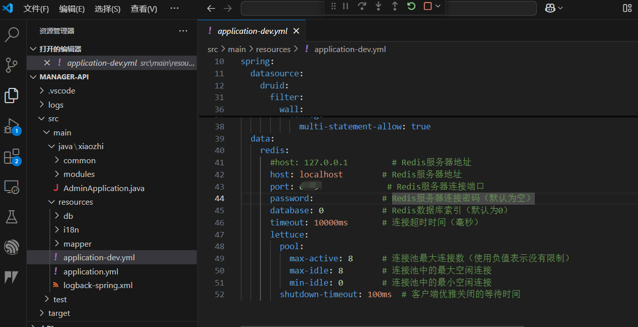 ② 在src/main/resources/application-dev.yml中配置Redis连接信息。