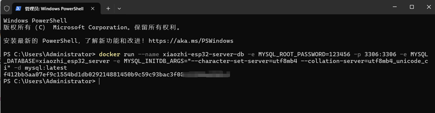 docker run --name xiaozhi-esp32-server-db -e MYSQL_ROOT_PASSWORD=123456 -p 3306:3306 -e MYSQL_DATABASE=xiaozhi_esp32_server -e MYSQL_INITDB_ARGS="--character-set-server=utf8mb4 --collation-server=utf8mb4_unicode_ci" -d mysql:latest