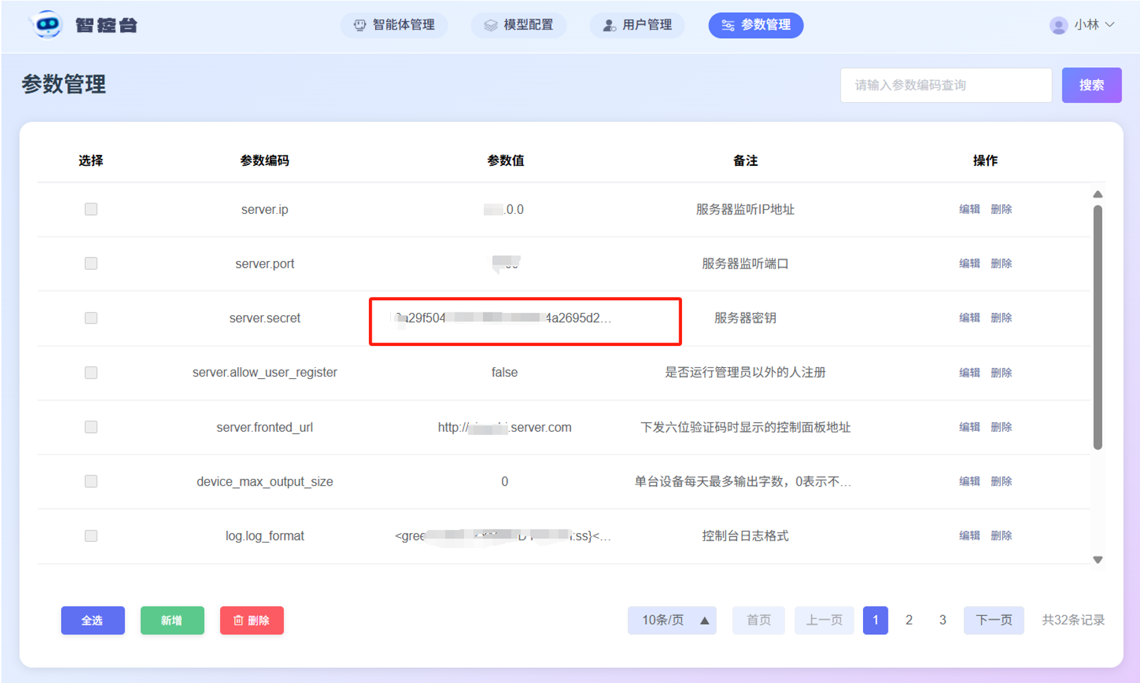 使用 超级管理员账号 登录系统管理后台(智控台),在顶部菜单找到参数管理(参数编码为server.secret),找到列表中第一条数据,参数编码是server.secret,它是随机生成的,每次重新部署都会随机生成,复制它到参数值。