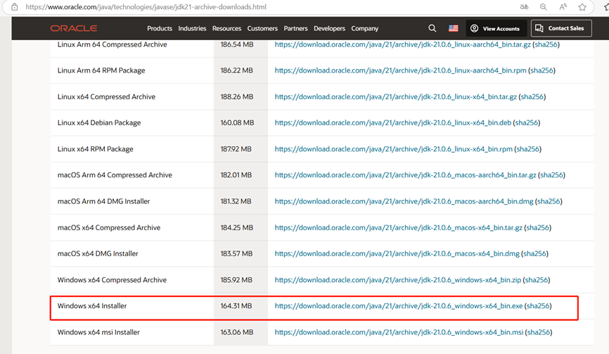 ① JDK下载网址:Java 。我是window系統行4位。解压后,可安装到D盘。例如我是安装到 D:JDK21_0_6下的。