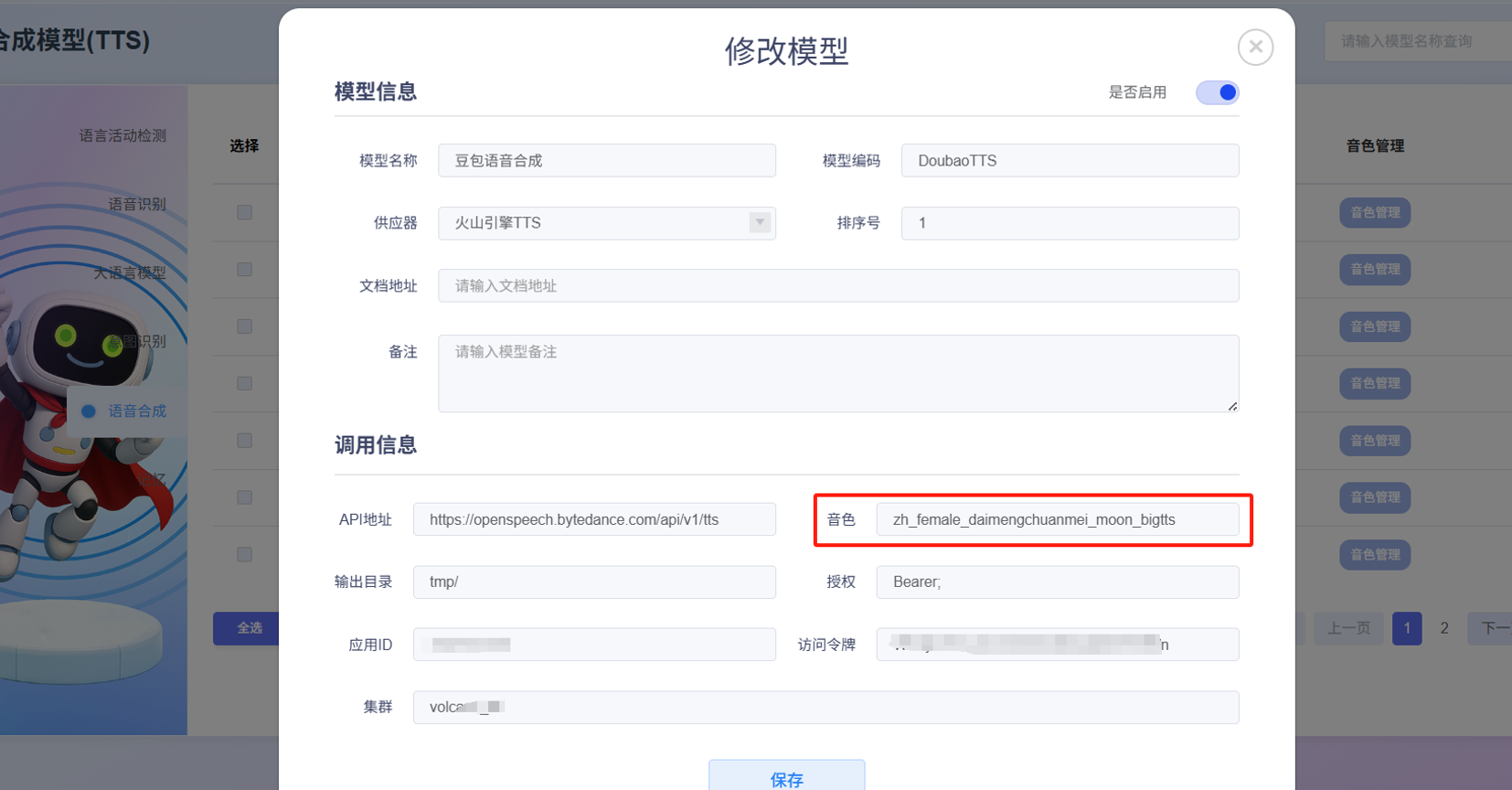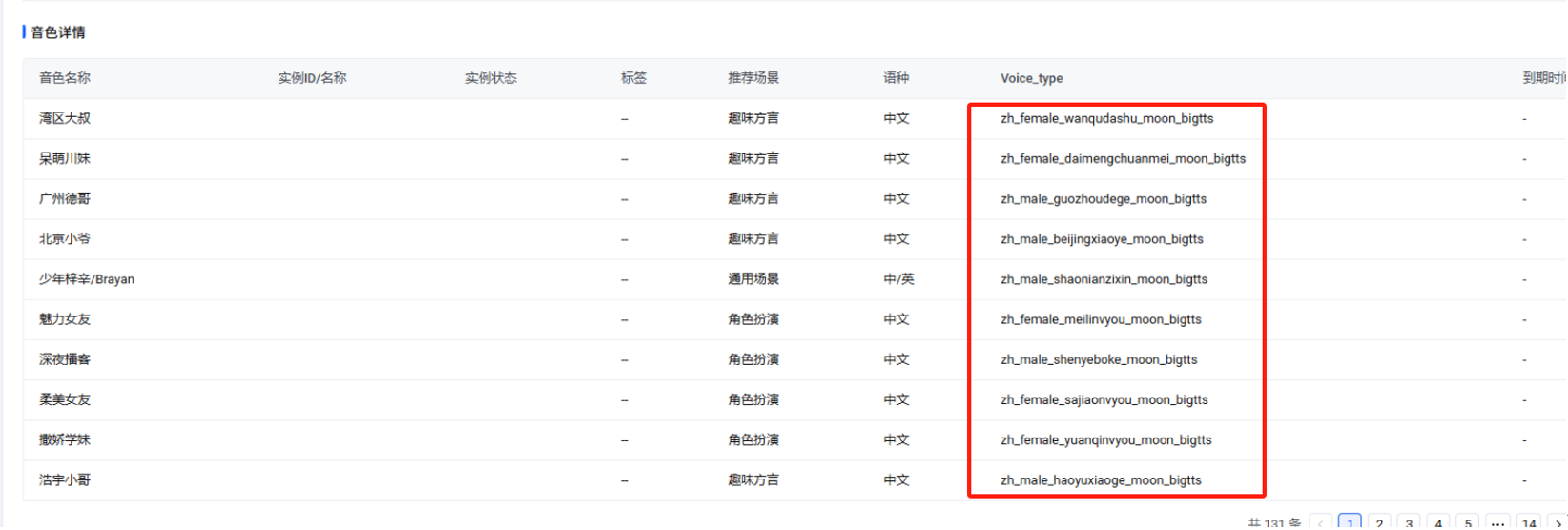 然后要记得在外面这里音色管理修改参数编码,根据你开通填的音色去修改
