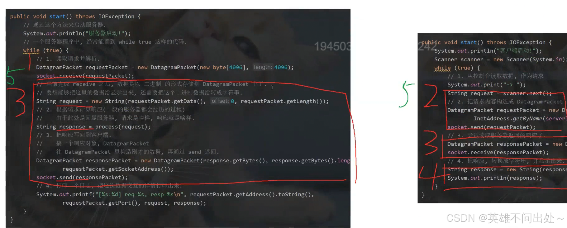 4. 把响应写回客户端,搞一个响应对象 DatagramPacket,往 DatagramPacket 里构造刚才的数据,再通过send返回