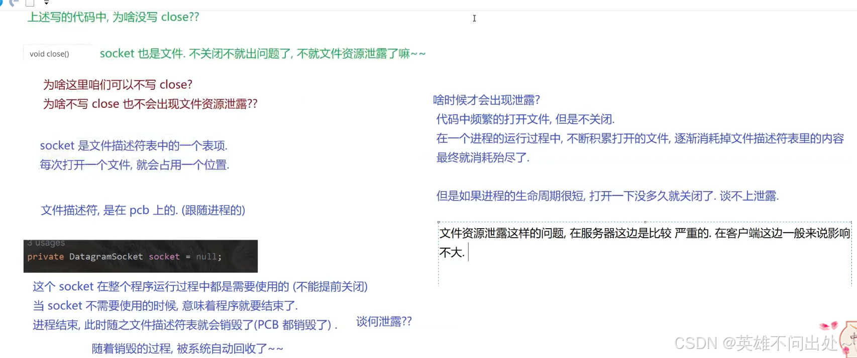 因为socket不需要使用的时候就关闭了,程序就结束了,进程也就结束了,随之文件描述符表就销毁了(PCB都销毁了),就不会泄露了,随着销毁的过程,这些文件描述符表会被系统回收