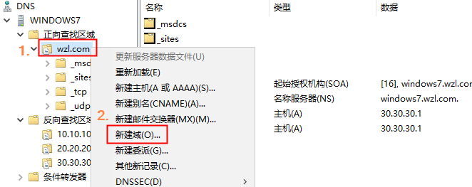 2.windows7安装IIS网页服务器,更改默认网站首页文件为index.html,文件内容为“www.wzl.com”;在windows7的DNS中添加www.wzl.com新记录;在windows9中(windows9的DNS只指向30.30.30.2)访问www.wzl.com