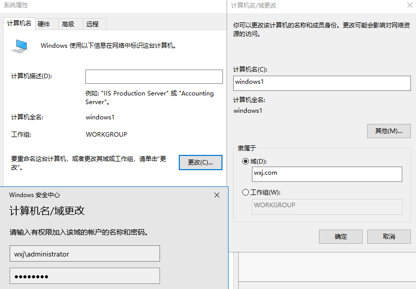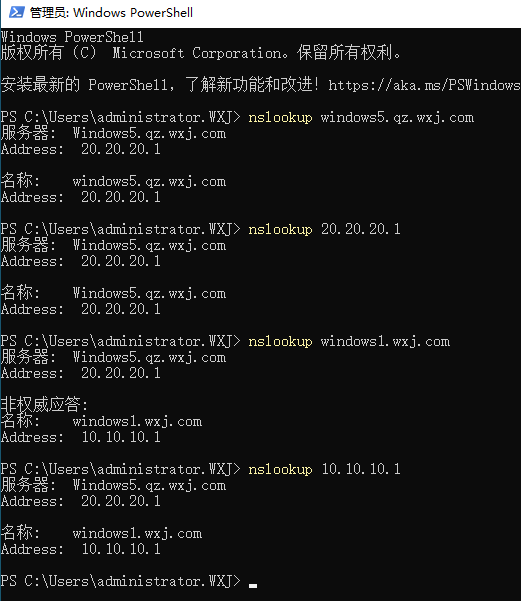 windows5的DNS为主20.20.20.1和辅10.10.10.1(注意此处要装子域的主DNS,主一定要设为自己的IP20.20.20.1,辅设为10.10.10.1使能自动委派过来),加入域wxj.com后用域最高管理员登录