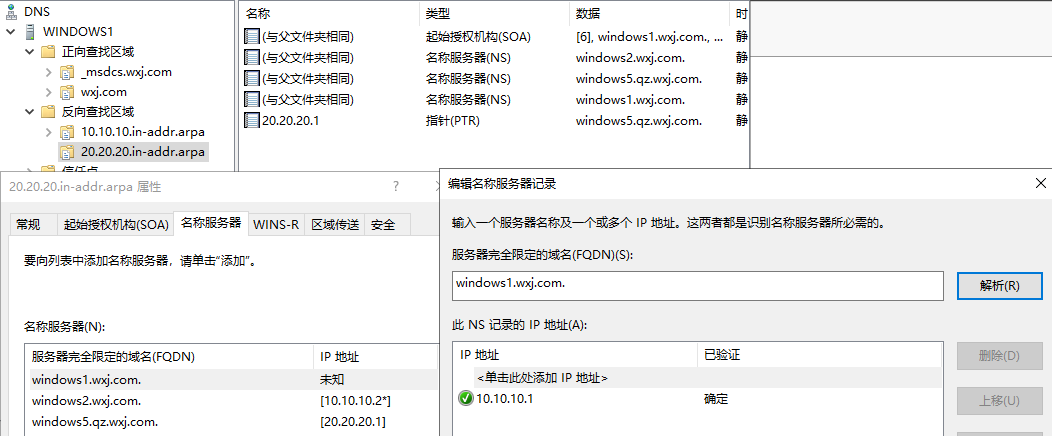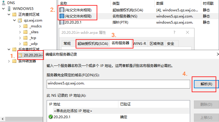 9.反向20.20.20.in-addr.arpa设置windows1起始授权机构和名称服务器