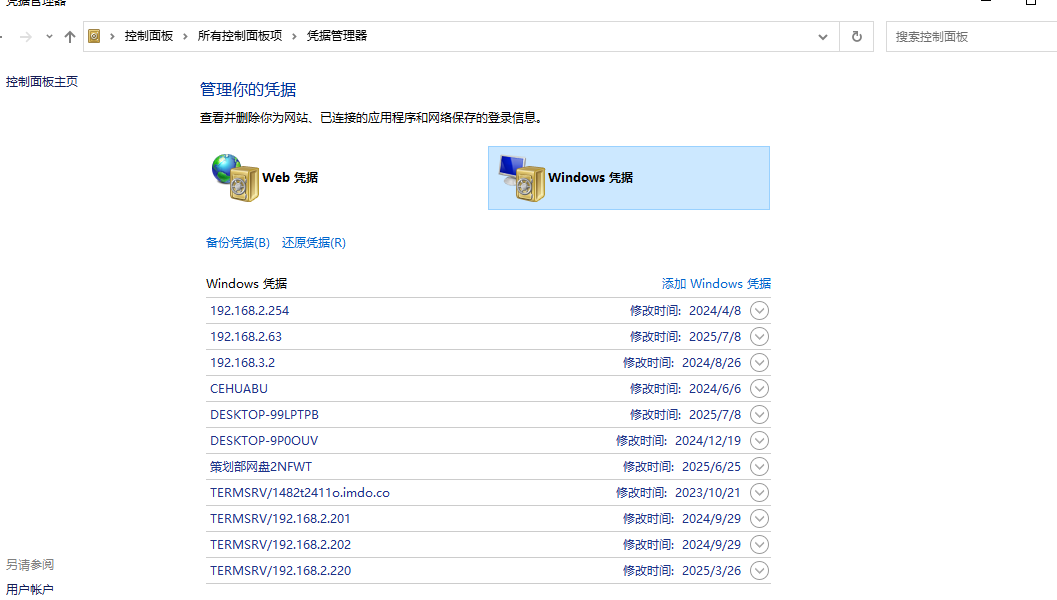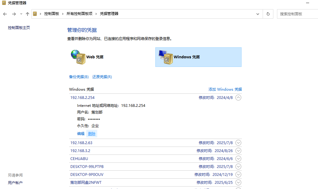 3、找到对应电脑IP或者主机名的Windows凭据,删除掉重新添加,添加选着添加Windows凭据