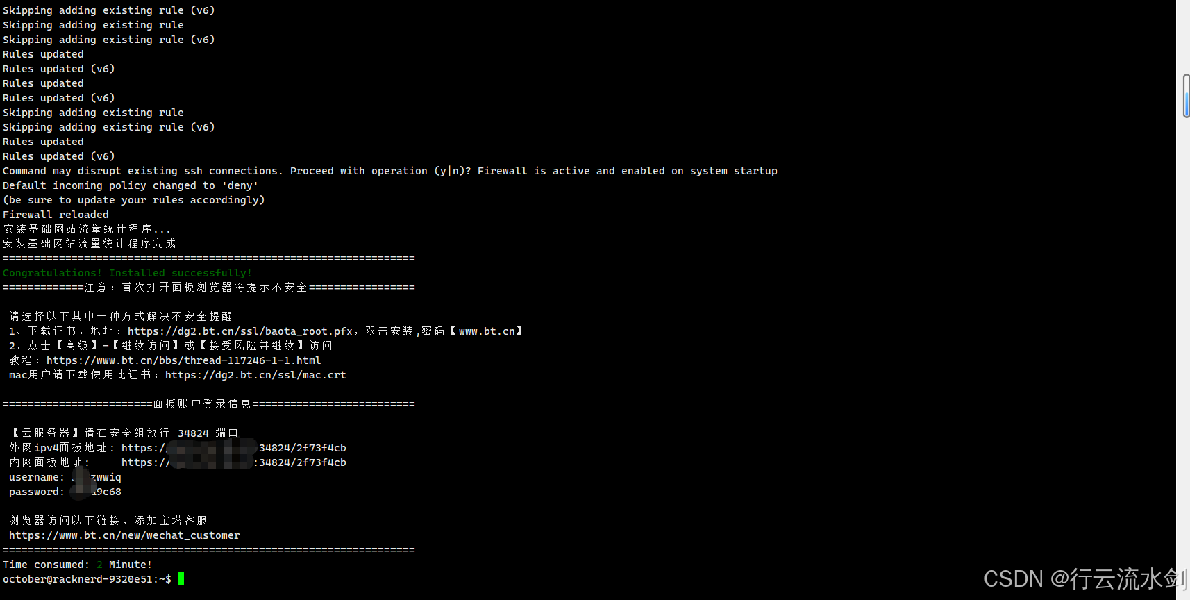📌 安装完成后,会输出面板登录地址、用户名和密码,请务必截图或复制保存!
