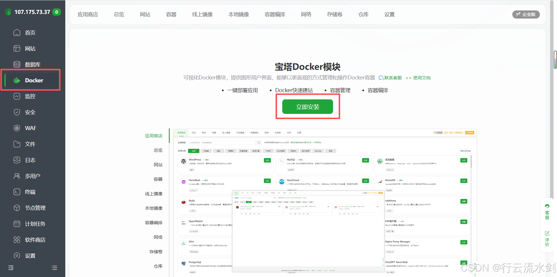 在左侧菜单找到并点击 “Docker”;