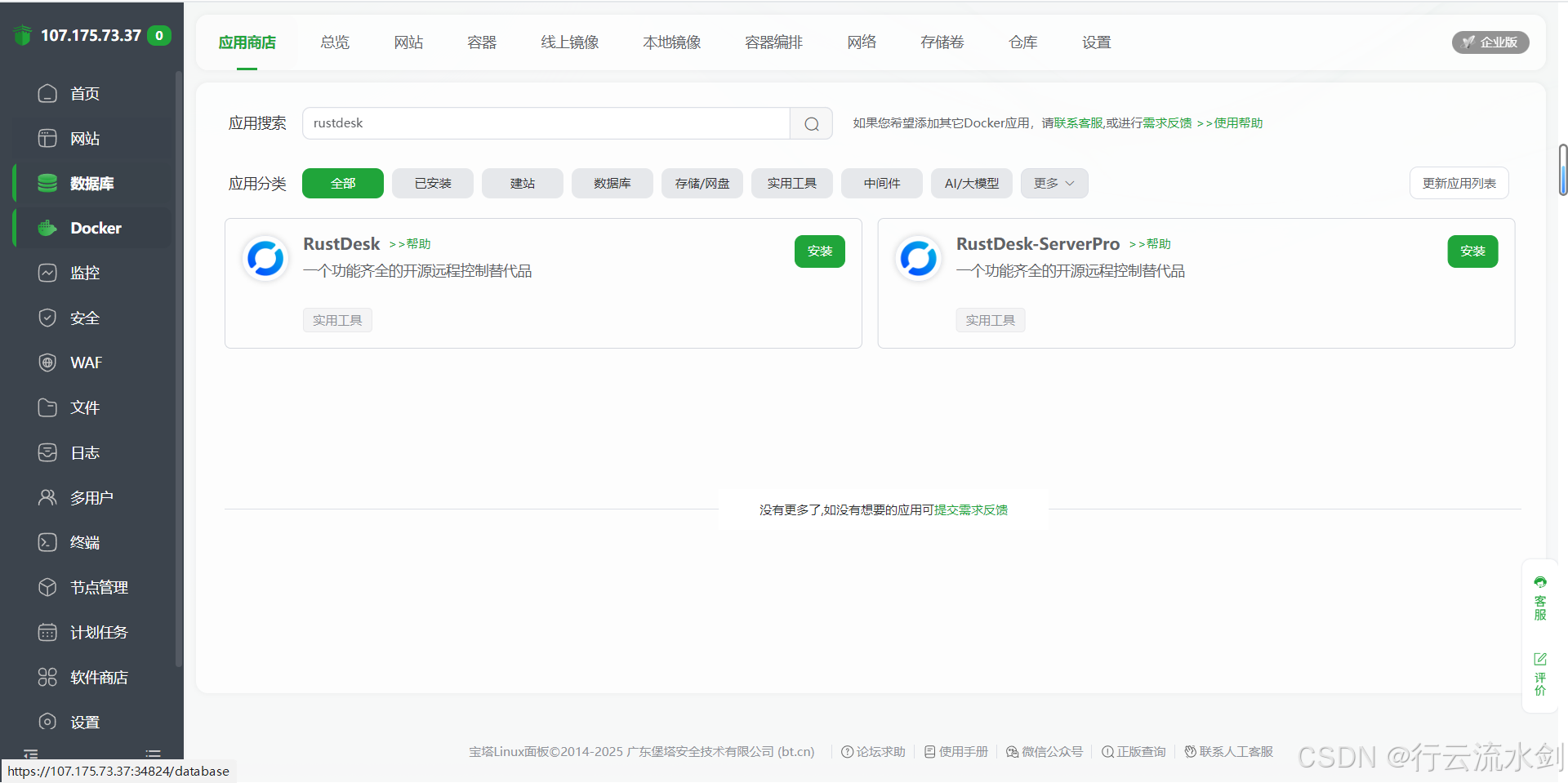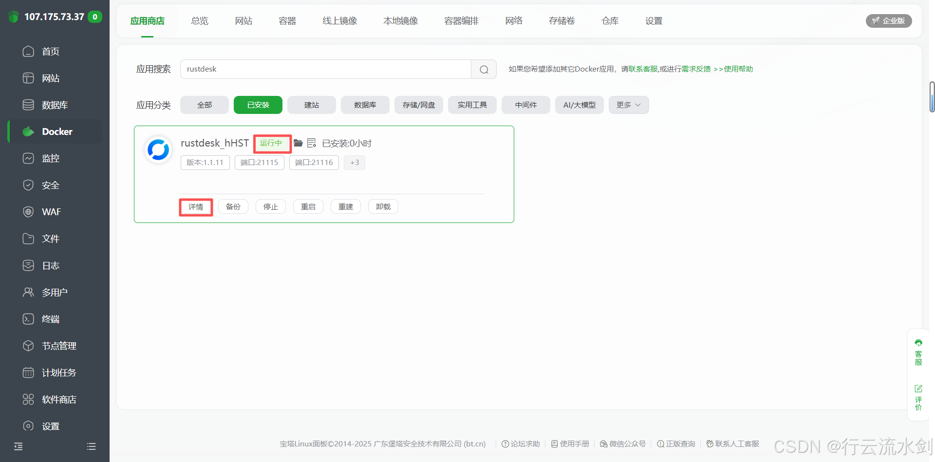 通过 宝塔面板 + Docker 的组合,我们实现了 RustDesk 服务端的零命令、可视化部署,整个过程简单高效,非常适合个人用户、开发者或小型团队搭建私有化远程控制方案。