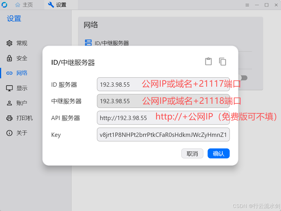 详细配置如下,其中key在“🚀 四、部署 RustDesk 服务端”中获得