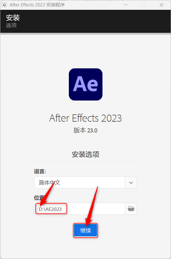 5.安装在D盘或其他磁盘【如D:AE2023】尽量不要安装在C盘,点击【确定】。