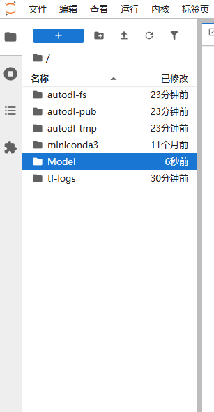 回到我们的服务器中,进入JupterLab,点击空白区创建文件夹方便后续文件管理,可以不用和你项目所在文件夹同名,比如我在服务器上是Model,但是本地是Test文件夹。