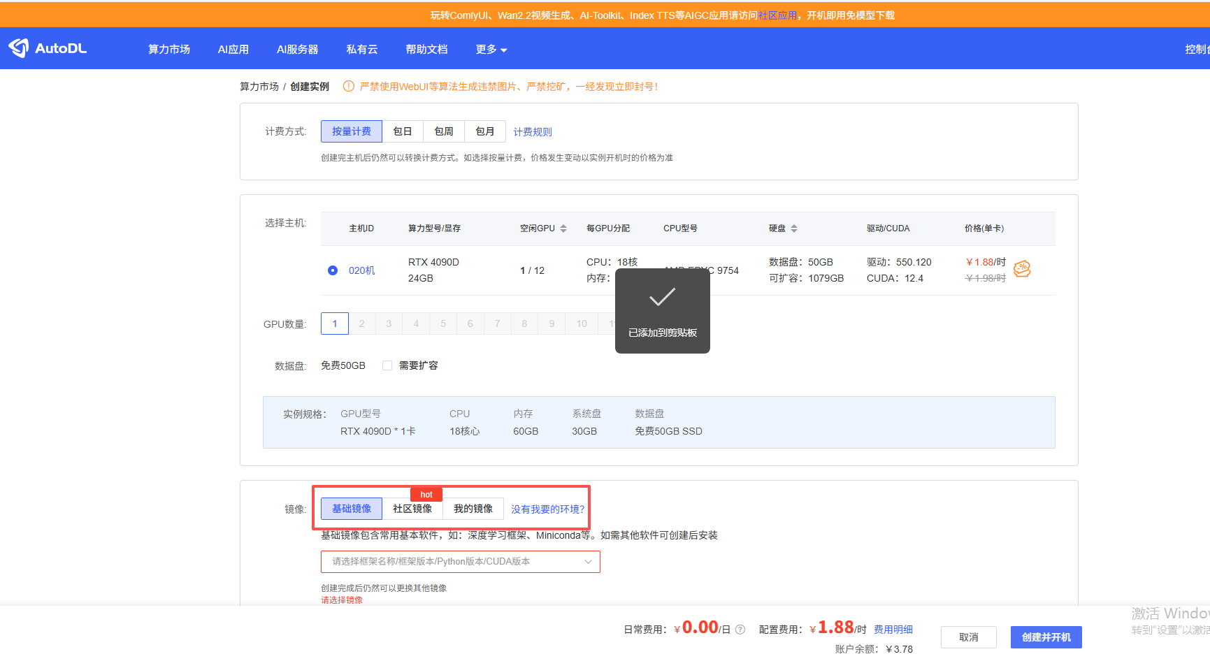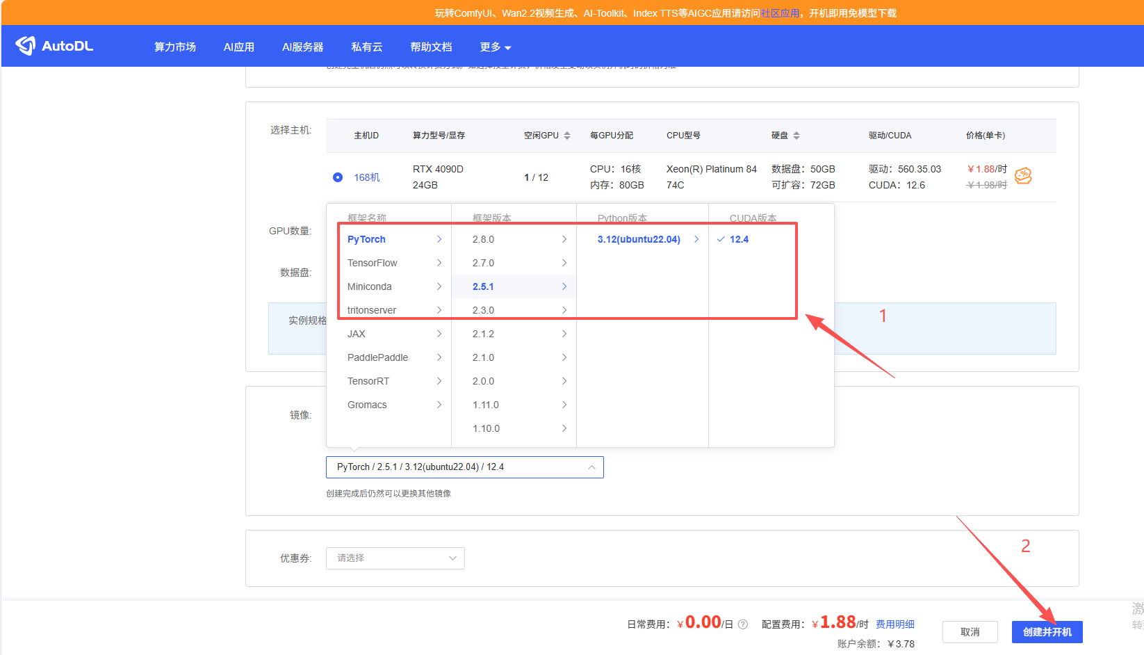 根据不同的深度学习框架配置不同的服务器,我使用的是Pytorch框架,所以这里以Pytorch为主,其他框架类似。配置好之后点击“创建并开机”