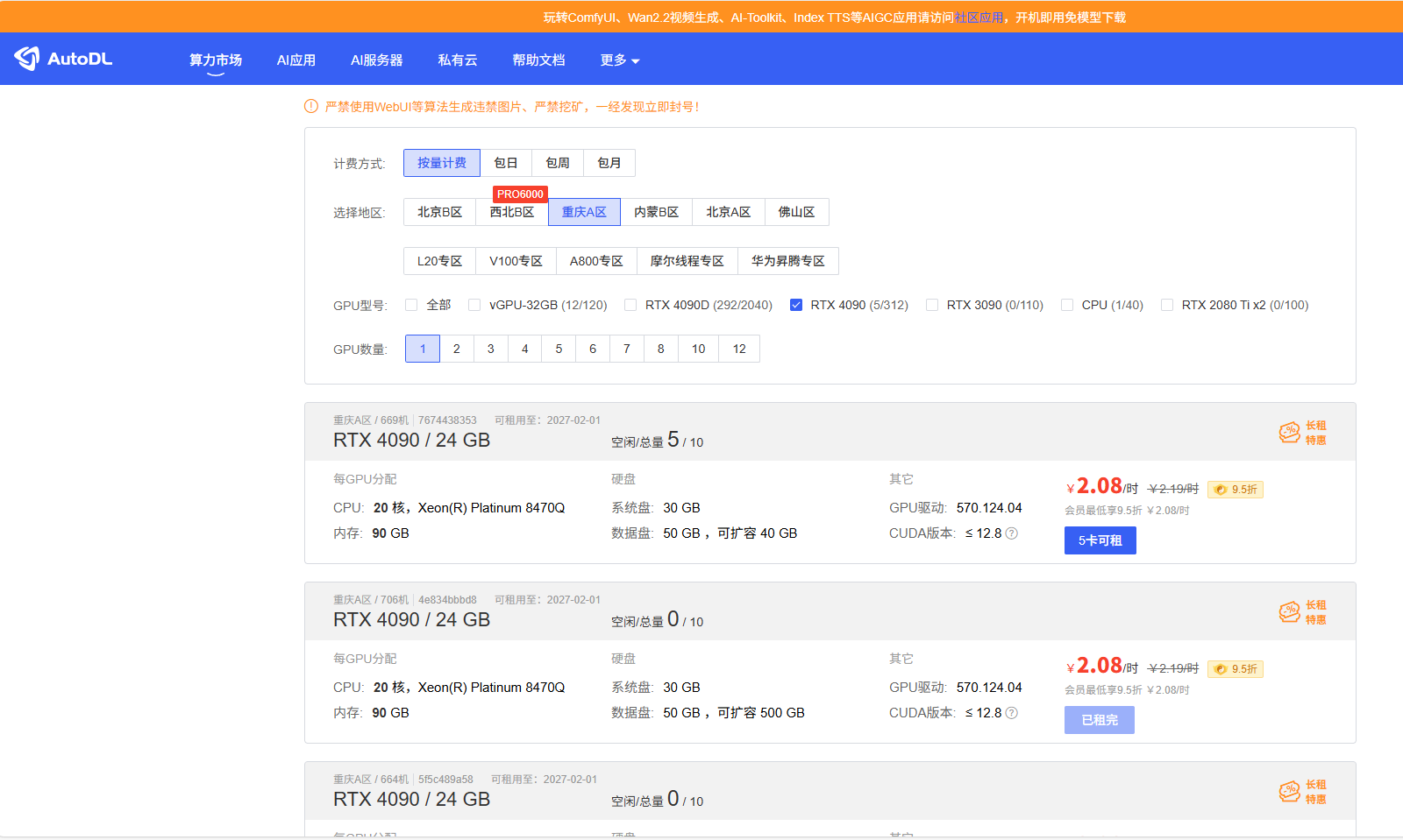 操作:找到合适的机器后,点击卡片上的 “1卡可租” 按钮。这里我们以重庆A区4090D为例子。