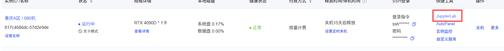 便捷的远程访问:通过直观的Web控制台,你可以像操作本地电脑一样使用远程实例。更重要的是,AutoDL支持Jupyter Lab和SSH连接,这为我们使用PyCharm等专业IDE进行远程开发与调试铺平了道路,能够将本地流畅的编码体验与云端强大的计算能力完美结合。