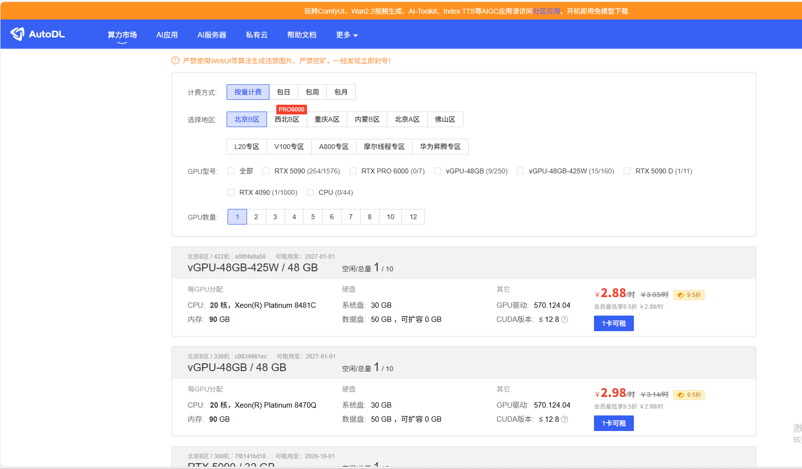 地区:主要看你选的显卡,哪里有你需要的显卡就在哪里进行租用。