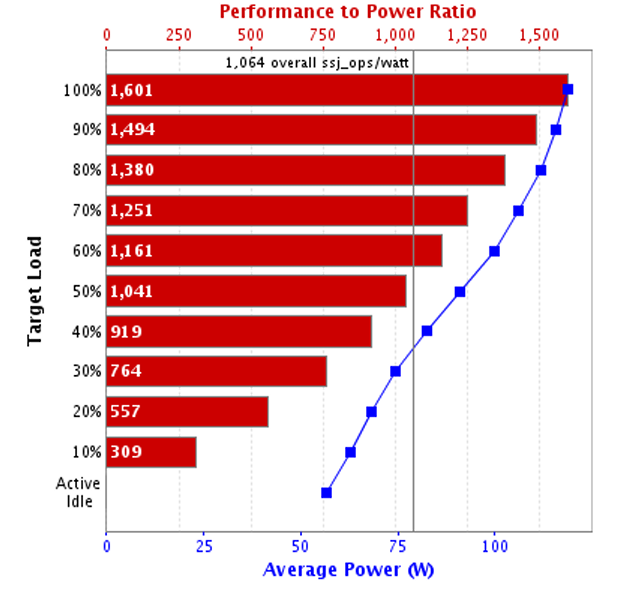 SPECpower™是由SPEC(标准性能评估组织)开发的一种性能/功耗比基准测试工具,是一套标准化的软件测试脚本,通过模拟从100%满载到活动空闲(Active Idle)状态共11个不同负载点,来全面测量服务器的性能和功耗,最终计算出一个核心指标:ssj_ops/watt(每瓦特支持的业务处理量)。