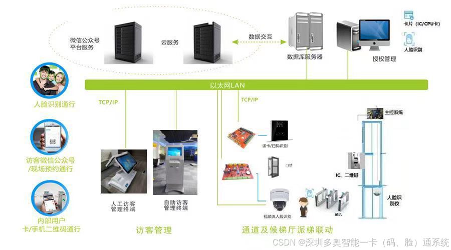 | 四、访客系统 | 线下访客机、线上预约 | 1. 硬件集成:线下访客机通常集成身份证阅读、摄像头、打印模块,需确认是否包含。 2. 流程对接:线上预约生成的二维码,需能通行指定的闸机、门禁和梯控,实现访客动线全闭环。 |