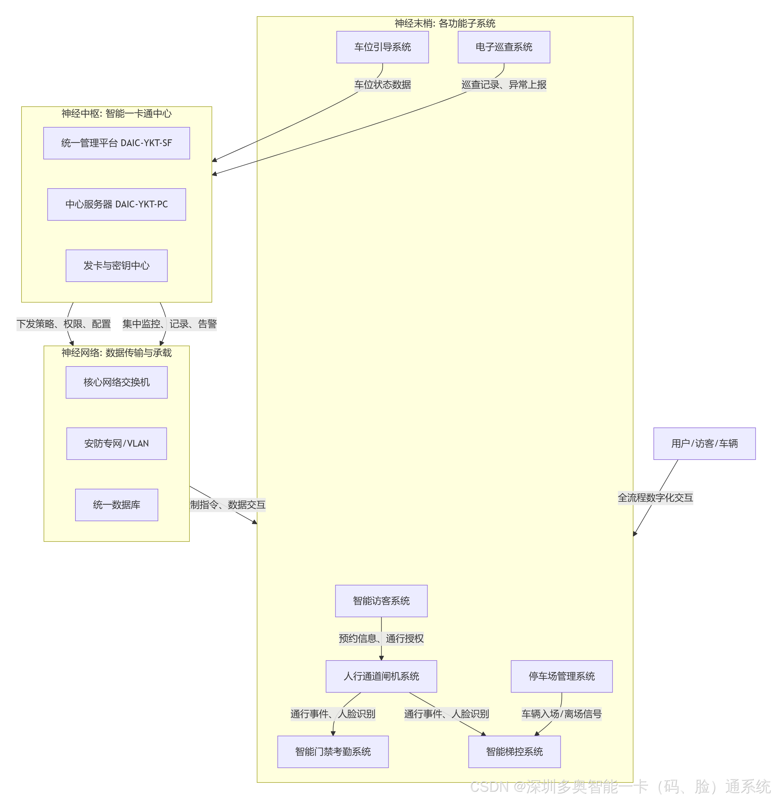 系统大脑。实现所有人员、车辆、权限的集中管理,是所有数据的汇聚点和指令发出点。