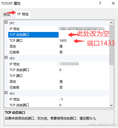 设置 “TCP 端口” 为1433(SQL Server 默认端口),清空 “TCP 动态端口” 输入框;