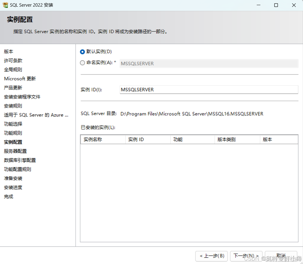 中间有个【实例配置】,有两种方式,建议使用【默认实例】,后续使用方便