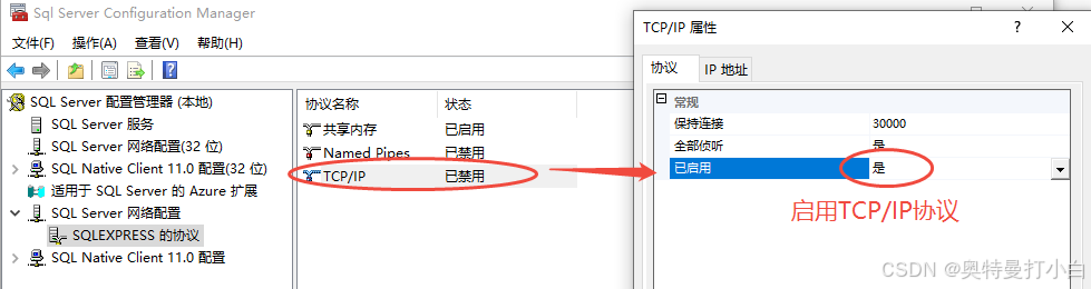 3. SQL Server网络配置,启用SQL Server的TCP/IP协议