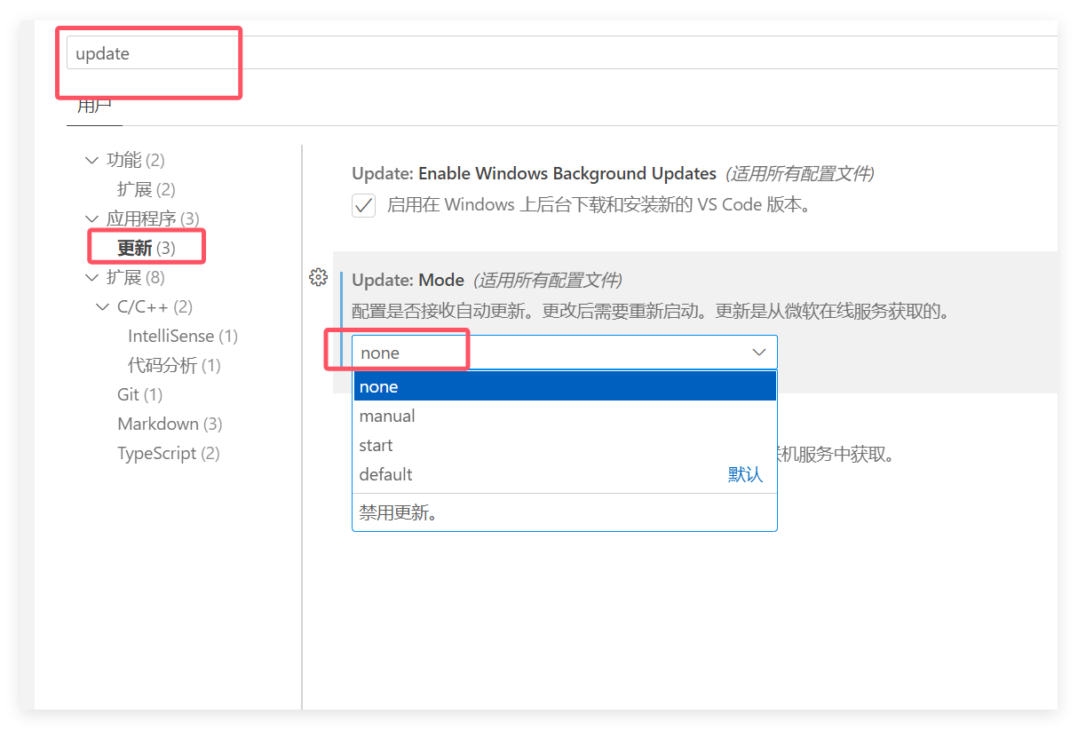 打开Vs Code设置,搜索“update”/自动更新,选择“none”,避免后续更新造成意想不到的问题。