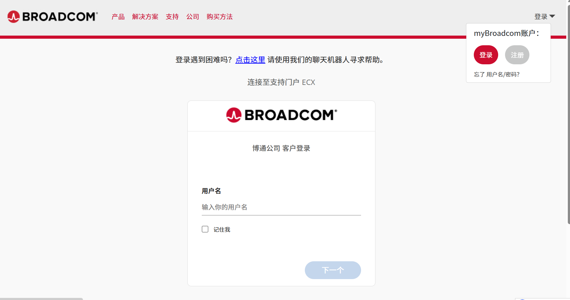 选择对应下载选项后,会到BROADCOM的注册登录界面,右上角注册/登录,注册需要gmail等账号,qq.com行不通