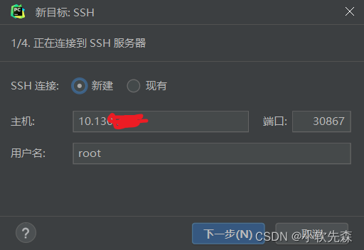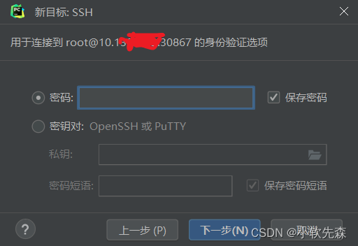 - 之后弹出这个框(不同版本是不一样的框,但是大差不差的,该有的内容都有,自己对照下填入就好了),主机就是服务器的IP地址,用户名一般是root,根据自己需求选择,端口也要填写服务器的
