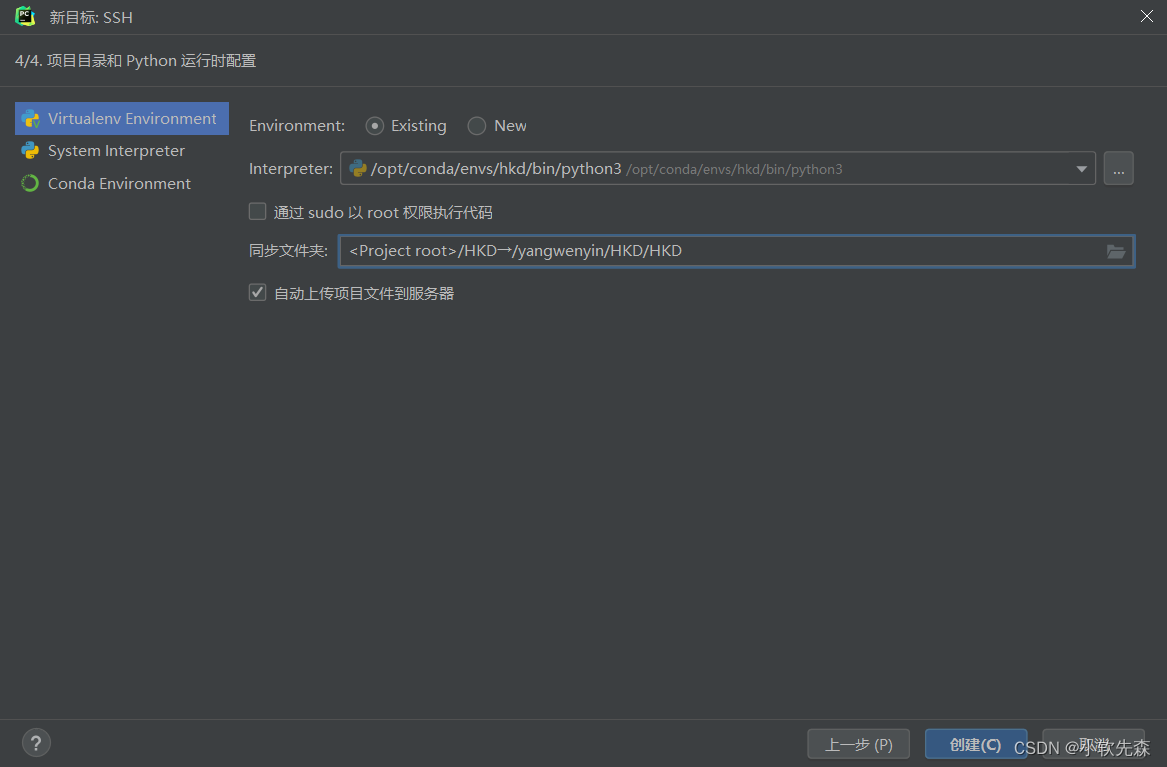 一般服务器都是conda环境的,所以我们选择使用远程服务器那边的conda环境,(前提是你在服务器那边是创建了这个conda环境哦,如果不知道怎么创建的可以参考我这篇文章创建conda环境)