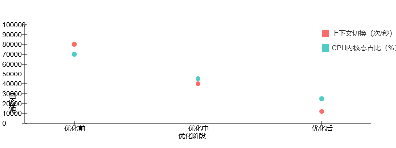 - 上下文切换次数从8万/秒降至1.2万/秒;