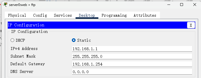 终端地址:PC0、Server0、Server1 手动配置 IP 及网关;