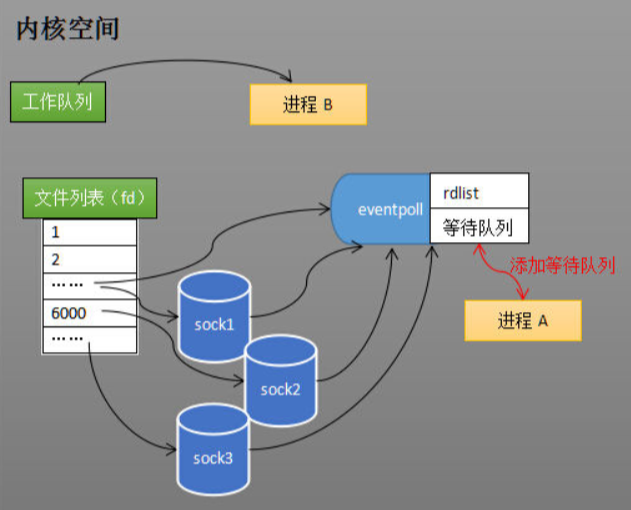 创建 epoll 对象后,可以用 epoll_ctl 添加或删除所要监听的 socket。以添加 socket 为例,如下图,如果通过 epoll_ctl 添加 sock1、sock2 和 sock3 的监视,内核会将 eventpoll 添加到这三个 socket 的等待队列中。