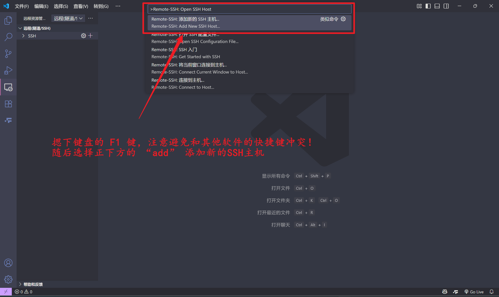 - 下载完成后,添加远端主机: 摁下键盘的 F1 键,输入 Remote-SSH: Open SSH Host 的字样,在下方找到添加新的主机。