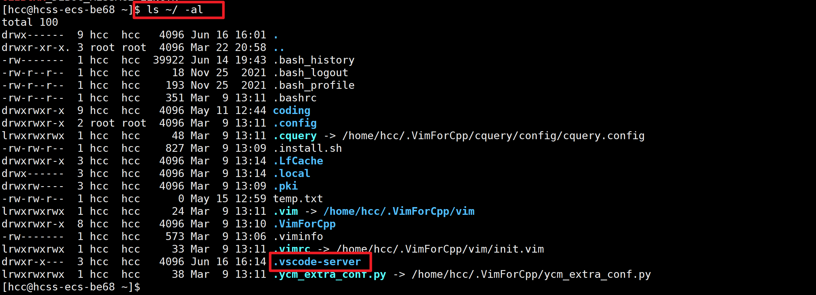 此时,在 Xshell 中执行 ls ~/ -al 就会发现存在一个 .vscode-server 文件夹,它用于存放 VS Code Remote Server 在远程主机上的运行环境和相关组件。我们安装的远程插件就在这里,其还存在 VS Code 远程服务端核心二进制及其环境相关设置等,如果更换了服务器或清理 .vscode-server,就需要重新连接远程主机,VS Code 会: