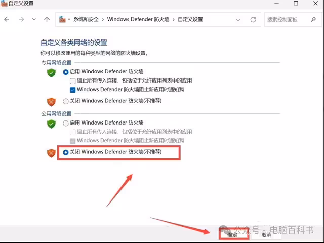 4、来到【自定义设置】界面,勾选【关闭Windows Defender防火墙(不推荐)】,然后点击【确定】即可关闭Windows防火墙。参考下图。