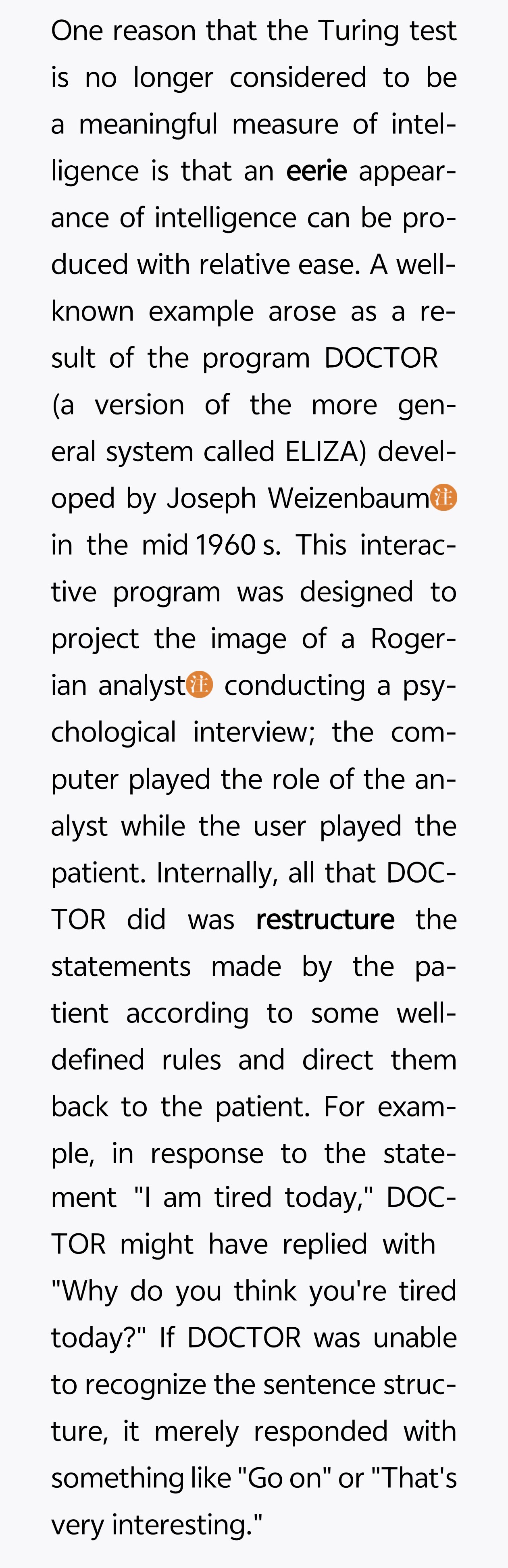 图灵测试不再被认为是衡量智能的有效方法的原因之一是,一种看似具备智慧的怪异形象可以相对容易地被营造出来。一个著名的例子是由约瑟夫 维森鲍姆在 20 世纪 60 年代中期开发的 DOCTOR 程序(通用系统 ELIZA 的一个版本)产生的。这个交互式程序旨在呈现罗杰斯式分析师进行心理访谈的形象;计算机扮演分析师的角色,而用户扮演病人。DOCTOR 在内部所做的就是根据一些明确界定的规则重新构造病人的陈述,并将它们反馈给病人。例如,在回应“我今天很累”的陈述时,DOCTOR 可能会回答“你为什么觉得你今天很累?”如果 DOCTOR 无法识别句子结构,它只会回答“继续”或“这很有趣”。